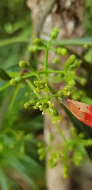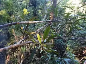 A juvenile lance wood has long thin leaves and a single trunk with no branches, this lasts for between 15 and 20 years. The juvenile leaves are long, narrow and 12 – 20mm in width deflecting downward. The leaves are primarily a very dark green colour with a purple underside. They also have a pronounced yellow-orange midrib occupying almost a third of the leaf area. Distinctive teeth are distributed along the margins of the tough and coriaceous leaves.