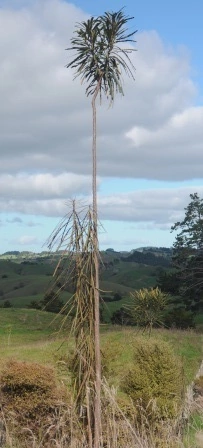 After about 15 years or when the growing tip gets about 15m from the ground the trunk begins to thicken and tree begins to develop branches at the top. The adult leaves are much shorter and wider, as can be seen in the photos below.